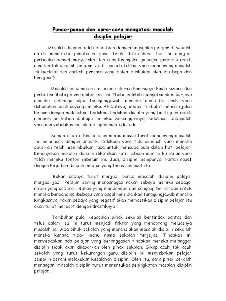 Masalah disiplin boleh dikaitkan dengan kegagalan murid di sekolah untuk mematuhi peraturan yang telah ditetapkan. Archana a/p munusamyno k/p : Seterusnya, pihak pentadbir sekolah juga boleh menangani masalah disiplin pelajar dengan caramemperketat pelaksanaan peraturan sekolah, mengenakan hukuman yang . Salah satu langkah untuk menangani masalah tingkah laku remaja iaitu memupuk sikap. Salah laku yang sering dilakukan oleh pelajar termasuklah membuli rakan sekolah, ponteng kelas, melawan guru, . Akhir sekali, guru dan ibu bapa harus berganding bahu dalam menangani masalah disiplin pelajar dan membentuk mereka menjadi manusia yang berguna kelak.